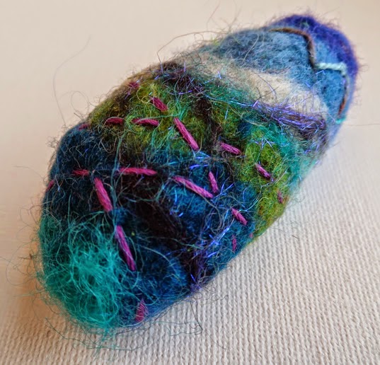 There is something mystical about lake stones and I'm drawn to them whenever I find myself on a Great Lakes beach. I had a sizable collection of Lake Superior and Lake Michigan stones and ran out of ways to display them. I was inspired by a Lil Fish Studios tutorial (excellent!) and the gorgeous felted rocks they create. This is my own take on felting stones with hand dyed wool and adding embroidery and beads.
